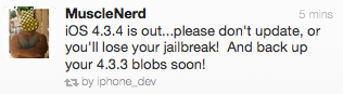 Apple has released iOS 4.3.4 patching the PDF security vulnerability which Jailbreak.me popular jailbreaking solution! So it is advised not to update if you are jailbroken and to store your blobs!