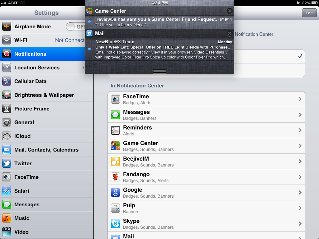 This was a must for iOS 5. Something that has always plagued iOS is the notifications. They would always pop up stop what you are doing and you would sometimes forget you had one or never be able to check what app they would come from. Not anymore. Well of course unless you want that. Notifications are simple. A little bar will now come up on the screen when you get a notification and your app will of course still be running. No more pressing close or view. Of course if you press view then you will be able to open the app with the notification. Notification center is amazing and in fact it is our next topic.