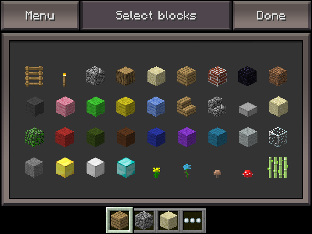 In short: It’s a dulled down version of the desktop version. It’s still very very good for all your on the go building needs. This game mode is strictly creative mode. All you have is 36 blocks to build your structures and you cannot craft say sticks with them. You can still make your structure very well though. The image you see above was made only using my iPhone and it has a whole other floor.