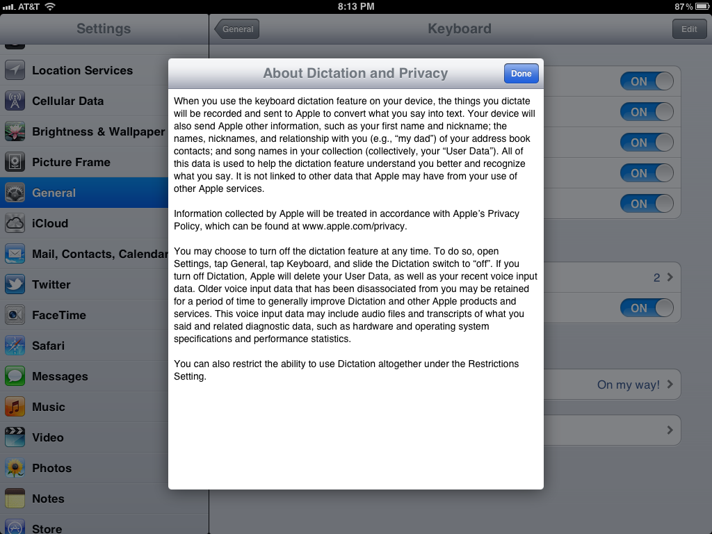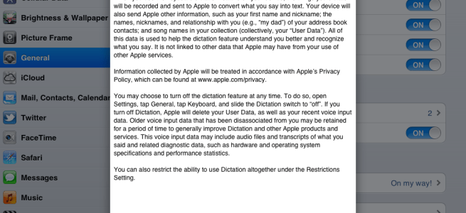 Ever sense we have seen iOS 5.1 there hasn’t been anything noticeable. Until know. In the settings for the iPad in the newest 5.1 BETA we see dictation information for the iPad. This is the siri dictation about. Kind of interesting. Could siri be coming to the iPad 2 in 5.1? Or launch with the iPad 3? We won’t know. All of the above is siri features. However there is no way to activate the dictation within the OS itself so we will have to wait and see. Hmmm.