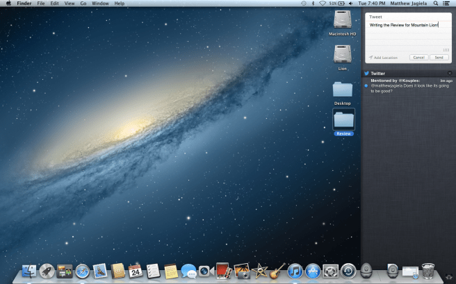 One of the things that I really like about mountain lion is the notifications and the notification center. Taken from iOS all you need to do to access notification center is take to fingers and slide them from the very right of your trackpad and swipe left or hit the notification button in the top right of the screen! You can also hit the tweet button and send a tweet to twitter and eventually to Facebook!